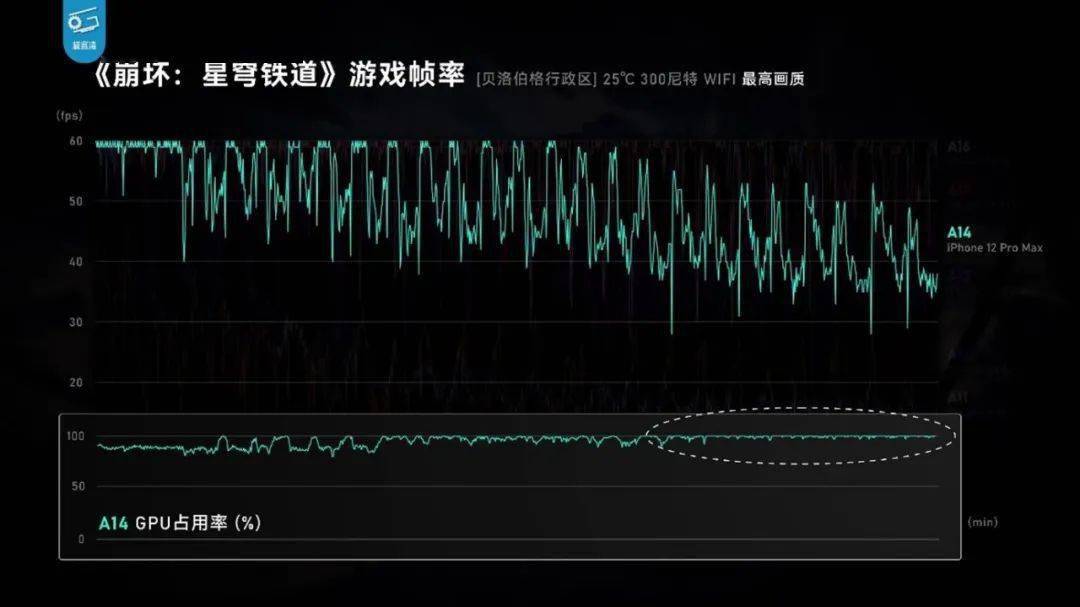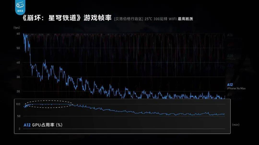 不过值得注意的是,这次测试当中的负载和我们以前测试过的移动游戏有所不同,你看A12这根线尤其明显,本身A12就已经有年头了,渲染分辨率还如此之高,A12刚开始的时候可以跑到60fps附近,此时的GPU占用率就已经有了90%以上,而随着A12降频,GPU占用率就直接顶在了100%的高位。