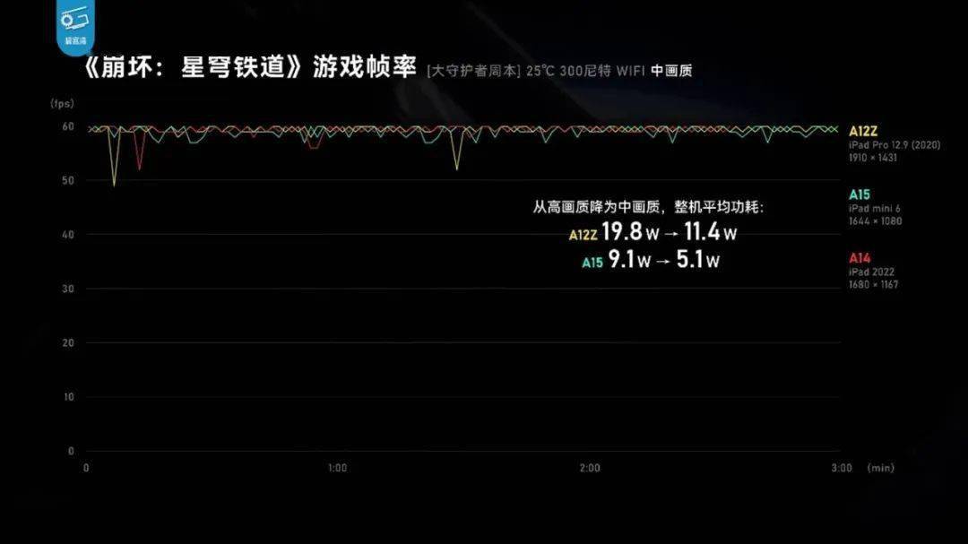 iPad这边,A15的iPad mini6以及几款A12Z、M1、M2的大iPad都可以跑到稳定的60fps,A14的iPad在最高画质下由于分辨率太高,GPU全程满载,无法跑到60fps,而当我们把画质降低到“中”预设,A14的iPad 2022也可以跑满60fps了,mini6和A12Z的Pro 12.9功耗降低了将近一半,这当中大部分还是分辨率降下来的功劳。整体来说,崩铁在战斗场景下的压力比起行政区是接近甚至略低一点点的。