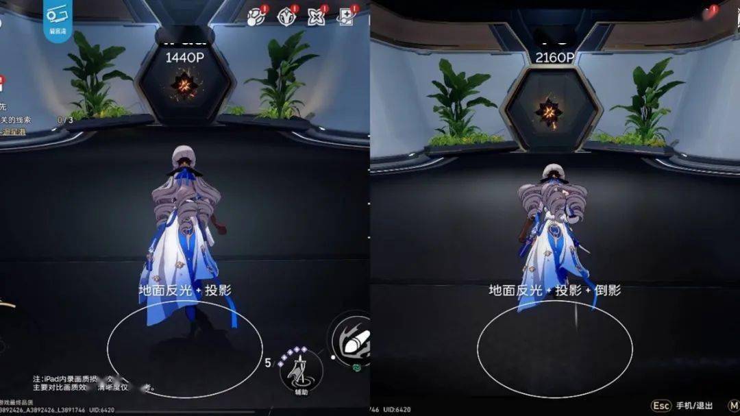 在放成绩之前,我们要先来看看iPhone、iPad和PC三个平台之间的画质和分辨率分别有着什么样的差别。先说结论,这次iOS和iPad OS端画质和PC是比较接近的,大多数情况下很难看出差距,尤其是iPad的分辨率史无前例的高,画质上的差距就更小了。主要的差距集中在两点:1. 地面反射上存在一定差距,在空间站里,PC的地面反射是比较明显的,包括人物、场景都会在地面有相应的反射。但iOS端就只有反光。2. iOS的贴图质量比起PC低一些,这个可以通过画质选项里的“场景细节”来调节,基本上iOS的高对应PC的中,iOS的中对应PC的低,iOS的低对应PC的非常低。但在整体的光照、阴影、Bloom等方面,两者基本没有区别,而且画质选项也是相同的,所以性能还是有一定的可对比性的。