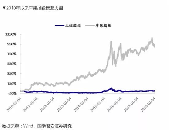 数据统计显示,从2010年1月到2017年末,A股上证综指最高涨幅59%,而苹果产业链指数最高涨幅达到1079%,是前者的18倍。