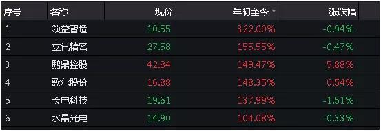 而在苹果产业链中,年内涨幅的概念个股也不少,多达6只个股年内股价已经翻倍,其中最高涨幅已经高达322%。