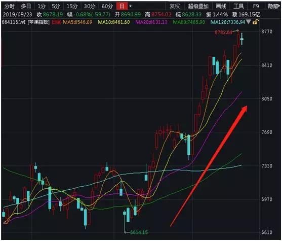 同样的,苹果概念指数下半年也开始出现了明显的涨幅。从8月6日至今,短短一个多月时间,指数从6614.15低点一路涨至最高8782.64,区间涨幅高达32%。
