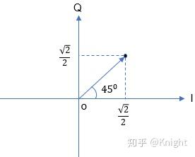 回答这个问题不得不提图1所示的矢量坐标系 (复坐标系),横轴为实部,纵轴为虚部。数字IQ调制完成了符号到矢量坐标系的映射,即每一个符号对应唯一的坐标点,该坐标点称为星座点。每一个星座点与原点构成了一个矢量,具有幅度和相位信息,在 IQ 调制中,通常默认最大的幅度为1,例如图1所示的星座点确定的矢量幅度为1、相位为45°。