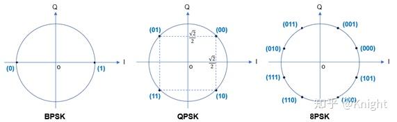 图4给出了常用的三种PSK调制方式的星座图:BPSK,QPSK和8PSK。按照上述结论,BPSK调制的比特率与符号速率相同,QPSK调制的比特率是符号速率的两倍,8PSK调制的比特率是符号速率的三倍。