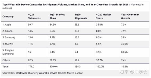 根据知名调研机构IDC的数据显示,2021年第四季苹果全球可穿戴设备出货量为5790万台,市场份额达34.9%,依旧和往常一样保持第一名的位置(数据包括智能手表和蓝牙耳机等设备),后面几家的市场份额加起来也不一定超过苹果。