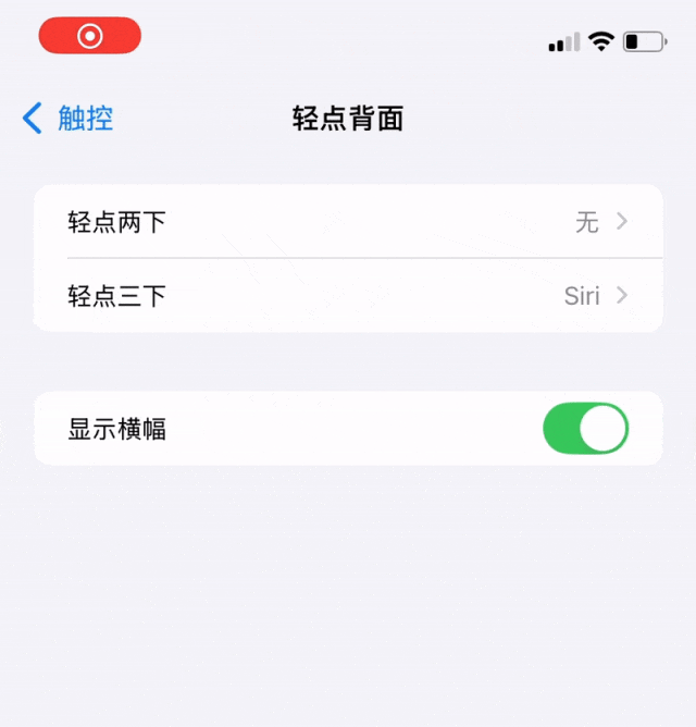 在“辅助功能-触控-轻点背面”中,新增了“显示横幅”的开关。作用是,当触发轻点背面功能时,就会显示横幅,避免用户不知道触发了该功能