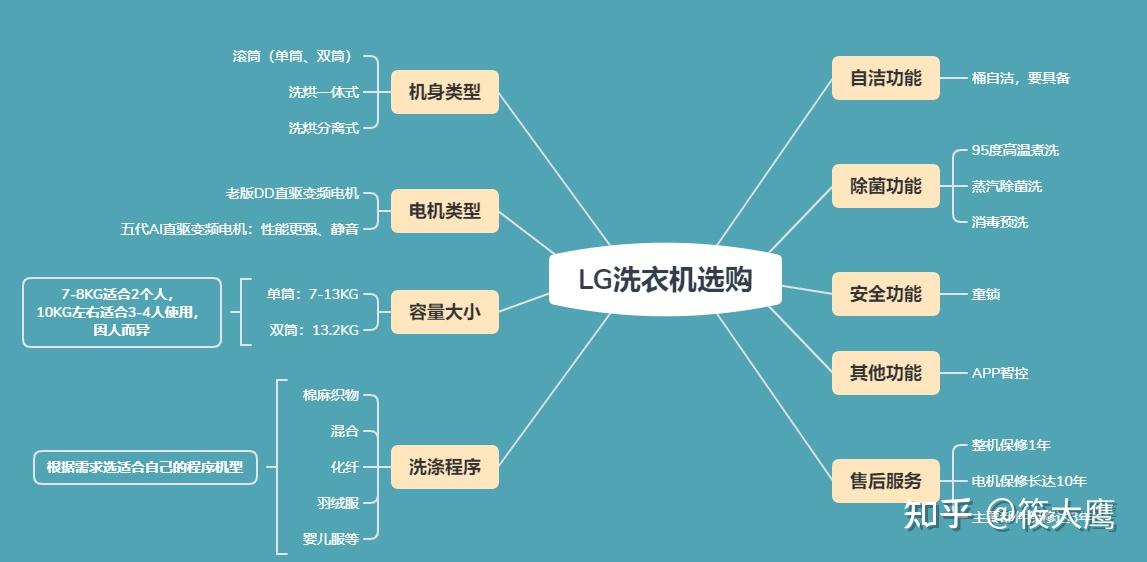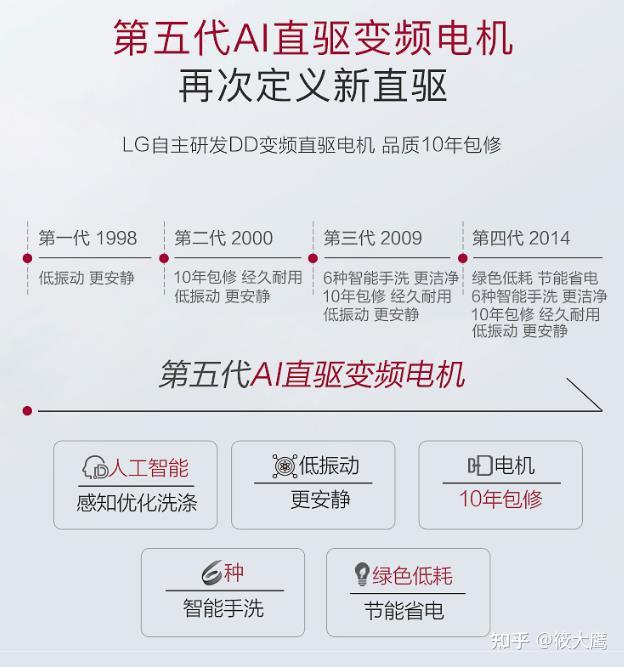 若想要单一功能,只洗不烘建议选滚筒洗衣机(有单筒和双筒喔!)若家在南方,经常下雨的,或者家在北方,雾霾天不想晾衣服的,还有家是小户型没有阳台的,建议选洗烘一体洗衣机。若追求快速烘干效果,想洗烘分开工作的,建议选洗烘套装洗衣机。2、电机类型LG洗衣机用的是DD直驱变频电机,一级能效,比较静音,特别是新升级的五代DD直驱电机,也就是五代AI直驱变频电机,能感知衣料和形状自动调节洗涤模式,更加智能,更静音。