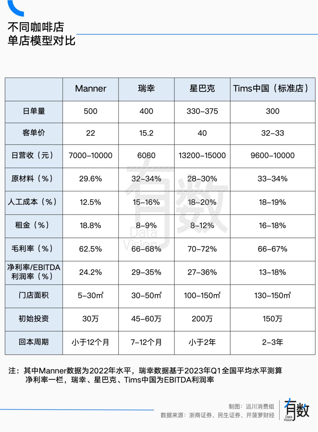 一位投资人曾表示,早期一家Manner的前期投入只需30万,3个多月就可以回本[12]。对比而言,瑞幸一开始的回本周期为在2年左右[13]。