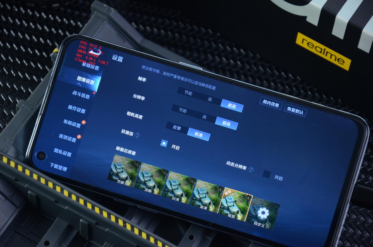 我个人实测在超高帧率下玩《王者荣耀》一局游戏,平均帧率在93.2,这可以说是很稳定了。当然这里并不是指所有高帧率游戏都能稳定运行,像玩《原神》的时候,如果在特效全开、帧率为60情况下运行20分钟,realme真我GT的平均帧率为55.1,做不到稳定帧率运行。