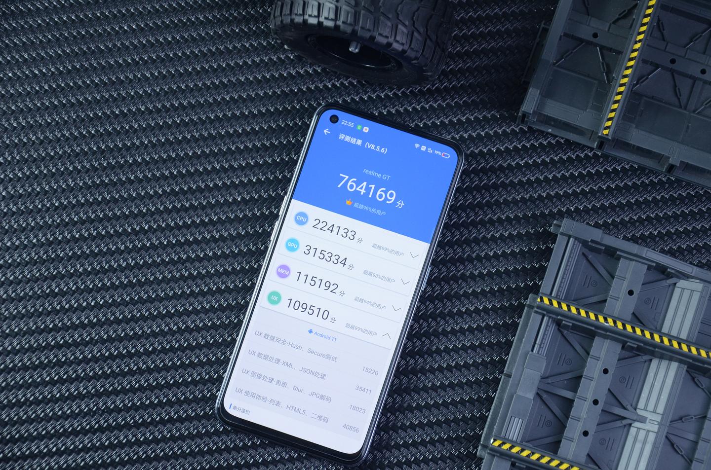 说完外观设计,我们再来一同看看realme真我GT的“性能”这部分内容吧。realme真我GT搭载了“性能强悍”的骁龙888 5G处理器,通过安兔兔进行性能测试后,得到了764169的高分,作为一台定价不足3000元的手机,这个成绩我除了说“给力”也找不到其它合适的词语了。