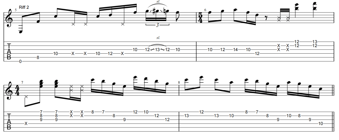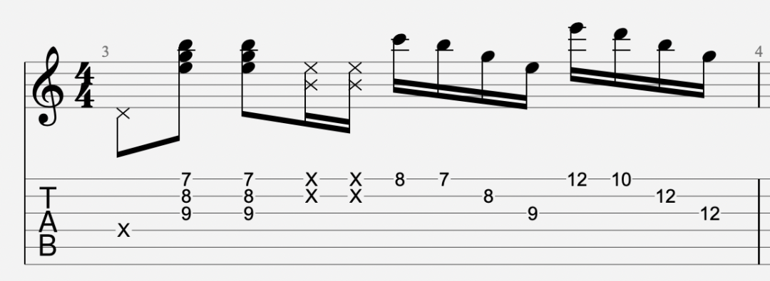 在这种结构里面,和声的信息相对传递的较少,所以为了应对越来越多在和声上表达的需求,传统的金属riff在经过发展之后,有了全新的表达方式。