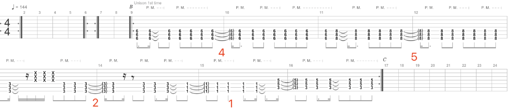 这种方式还有一个好处就是,因为我们知道金属音乐在演奏的时候是要开大量的失真效果的,所以整个背景很容易糊成一片,而这种方式成为了更加清晰描述和弦特征的一种常规方式,因为它有效避免了长时间在低音弦演奏这个问题。