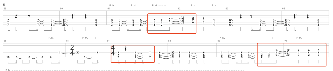 来到我所提及的2分03秒位置之后这里出现了b2级的强力和弦(222的位置),以及#4级强力和弦(777的位置),以及最后一个红框里面连续4个和弦,从b2级来到#4级然后b6级,最后回到6级。这里全程使用强力和弦。