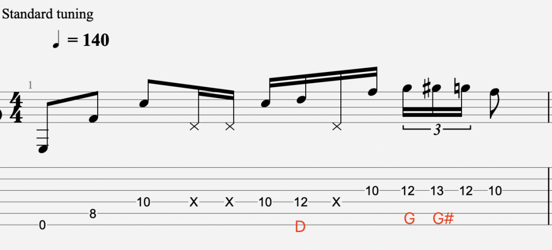 传统的金属音乐里面,你可能看到的大多数riff,基本上都在低音弦完成的,例如下面这种。