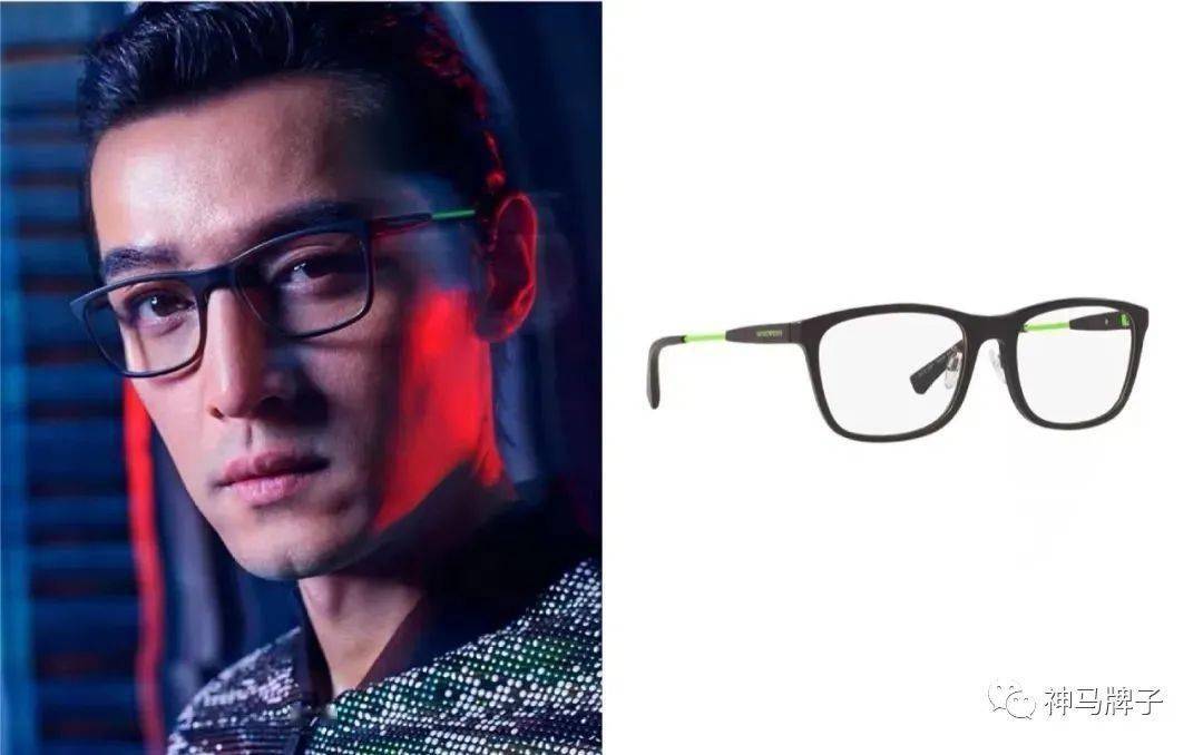 胡歌则戴过它们家的EA3165F。方形镜框沉稳大气,镜腿和logo处的荧光绿虽然吸睛,但面积不大,所以整体还是蛮日常的,胡歌的佩戴图也是商务感满满。这款国内价格是1580元。