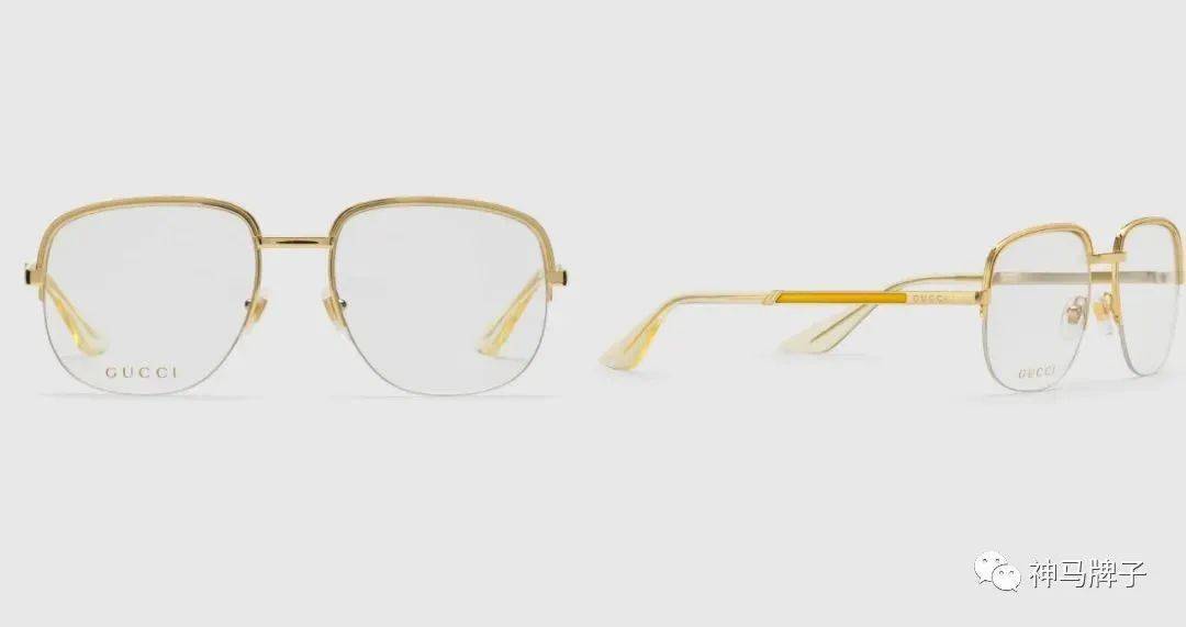 除了倪妮佩戴的款式,Gucci还主打这幅造型有点像飞行员墨镜的半框眼镜。它搭配了纤薄的金色金属镜框、装饰着黄色珐琅的镜腿,和透明的黄色镜脚,有一种既古典又现代的感觉,戴去职场也毫无压力,官网的价格是3800元~