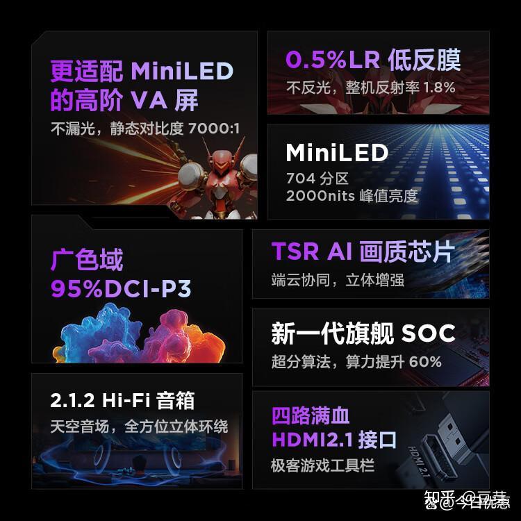 这款电视采用了专为Mini LED优化的HVA屏幕,静态对比度高达7000:1,配合2000尼特的峰值亮度,远超普通电视(500-1000nits),能充分释放HDR10+/杜比视界内容的动态范围。高光场景(如阳光、爆炸、金属反光)会更接近真实世界的刺眼感,画面更具冲击力。画面明暗层次更加分明,色彩更加饱满。无论是观看暗场较多的电影场景,还是明亮的体育赛事直播,都能呈现出令人惊艳的画质效果。同时,95% DCI-P3的广色域覆盖,让色彩表现更加真实自然,带来沉浸式的视觉享受。