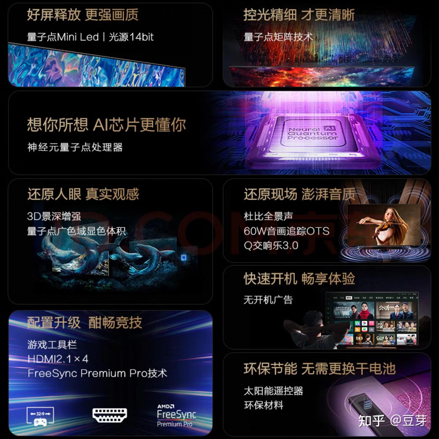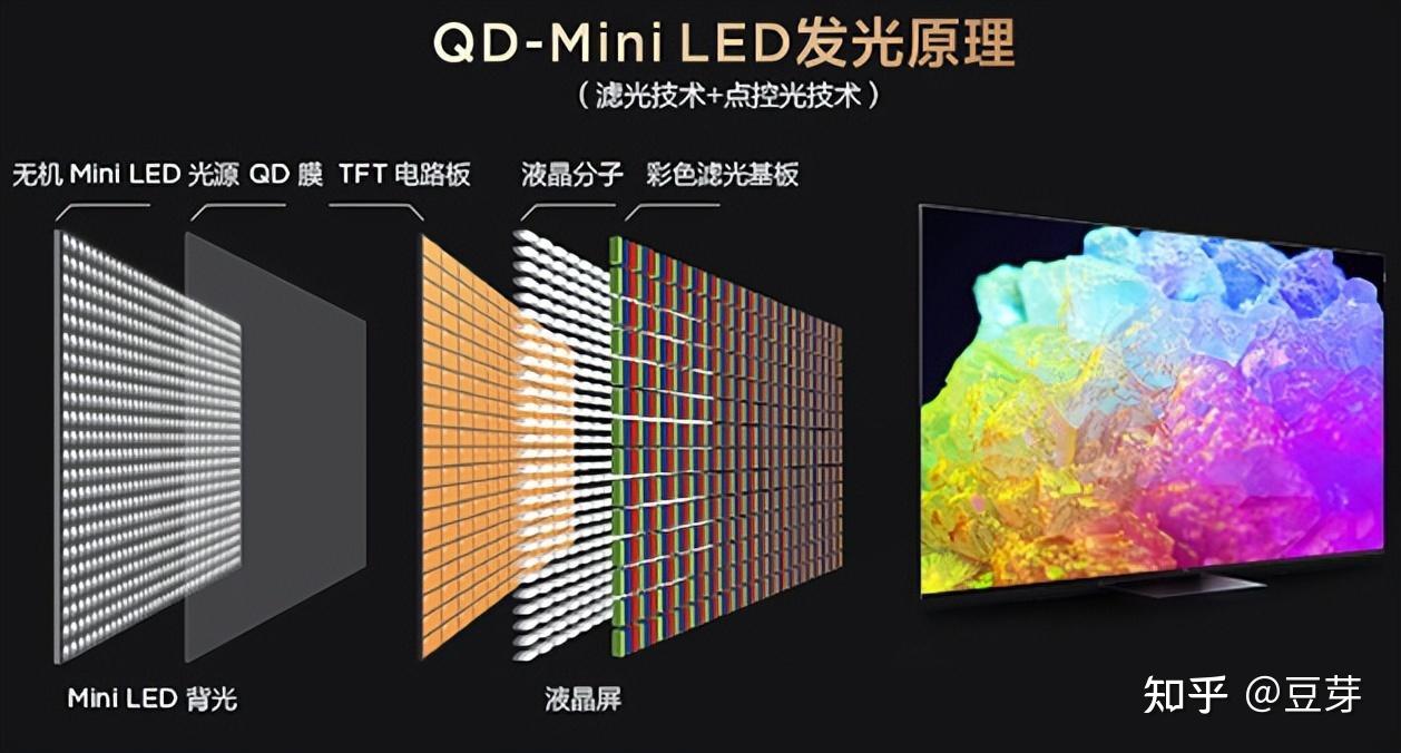 QD MiniLED:电视是由MiniLED背光板与液晶模组组成,MiniLED背光板被划分成多个分区,每个分区的发光亮度可以独立控制。QD:意为量子点技术;Mini LED:本质是液晶电视,意思是升级了背光灯,Mini LED电视的背光灯比普通液晶电视背光更微小更密集,用处有两个,一是提升画面背光均匀性,减少四角发暗问题。二是可以做更多的棋盘式控光分区,精细控制电视不同区域的亮度,有实际意义。两者结合起来的就是”采用了量子点广色域和Mini LED背光的液晶电视“。