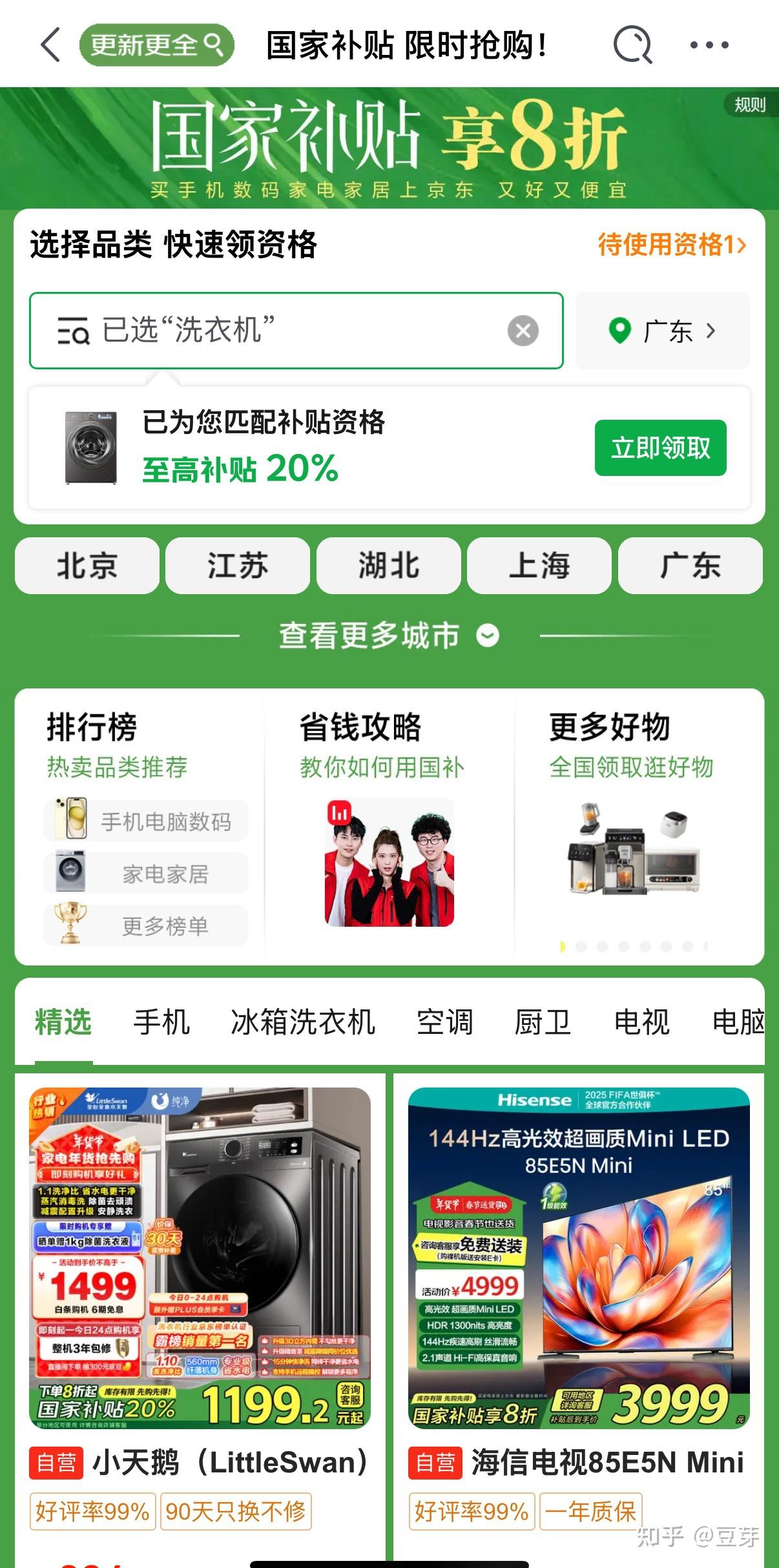 划重点:如果要买家电,国补资格的领取方法:在各电商平台的APP搜“国补”、“国补家电”等关键词,比如在京东的APP是搜「家电省2000」,然后进入页面就可以领到国补了!一定要先领,因为名额有限!
