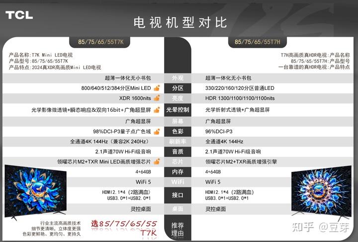 细节:85/75/65/55寸 T7H是330/220/160/120分区、HDR 1300/1100/1100/1100nits普通LED;85/75/65/55寸 T7K是800/640/512/384分区、XDR 1600nits Mini LED,画面更立体,细节更清晰。