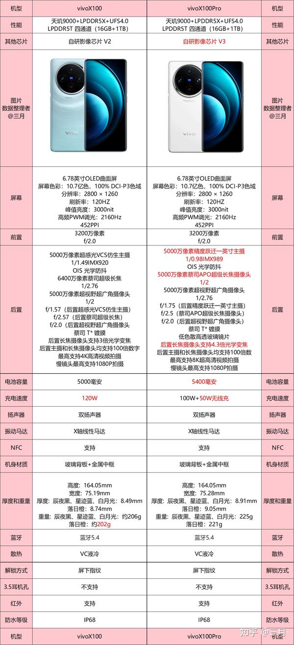 1、vivoX100采用的是V2影像芯片,而Pro版本则是V3,在制程,能效,算力方面,pro版本明显占优2、影像配置:虽然此次全系潜望长焦,但vivoX100ProAPO超级长焦摄像头,而且主摄是IMX989,底有一英寸大,在影像方面的表现强的离谱3、vivoX100采用5000毫安+120W续航电池方案,而Pro版本则是5400毫安+100W+50W无线充方案,续航方面Pro版本更强4、vivoX100约206g,而Pro版本则是225g,坠手感明显,而且Pro版本的相机模组凸起更大此外,vivoX100Pro还多了一颗HiFi芯片,理论来说音质体验会更好