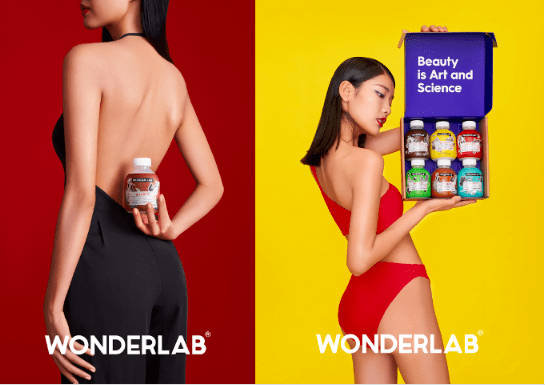 除了在产品定位上制造“矛盾感”,WonderLab还 在品牌视觉化设计上通过冲突来加深消费者印象。其品牌宣传海报通常为一位身材姣好的模特,若隐若现地展露着纤细的身材,配上色彩强烈的背景色,营造用户对瘦身的向往感。另外,品牌在产品包装上选择了圆润小巧的造型,并取名为“小胖瓶”,“小胖瓶”与纤瘦的模特形成了明显的反差,给予消费者强烈的视觉冲击,加强了品牌的记忆点,WonderLab的品牌名片就此成功打造。