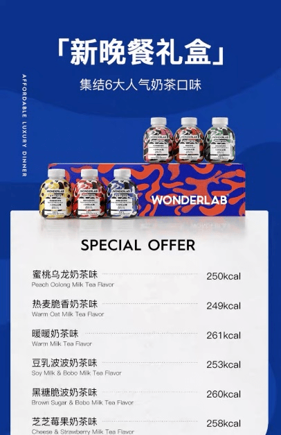 在产品定位上,WonderLab也下了一番功夫。当代年轻人,特别是年轻女性绕不开的话题之一就是奶茶,奶茶逐渐成为年轻人的“生活刚需”,但另一方面,奶茶的高糖高热量让不少追求好身材的女性“又爱又恨”。WonderLab就抓住了奶茶发胖属性与减肥代餐之间的矛盾点,进而推出了 奶茶味代餐奶昔。同时,为了进一步满足用户“减肥、代餐”的需求,往产品中加入了 饼干碎,在产生独特的饮品咀嚼感的同时也满足了饱腹感的代餐理念。多种自带流量的“网红零食”组合在一起,可以让消费者眼前一亮,从而引发其关注。