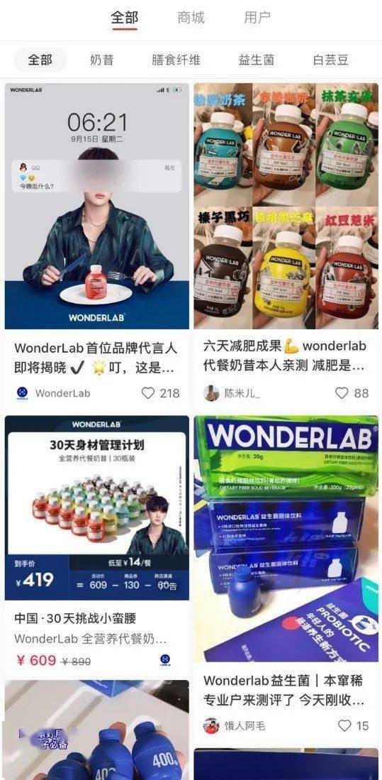 在这样的市场背景下,WonderLab成功把握了代餐市场的消费人群,即 90后年轻女性,她们大多关注“减肥、变美”等话题,与此同时,她们的健康素养更高,更偏好健康的减肥方式,于是WonderLab以 营养、高纤维、低卡等作为产品卖点,成功切入市场。